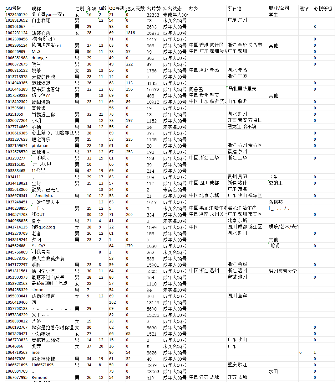可以提取的信息有好友的QQ号、头像、昵称、地区、等级、实名状态、职业、生日等信息,非常详细